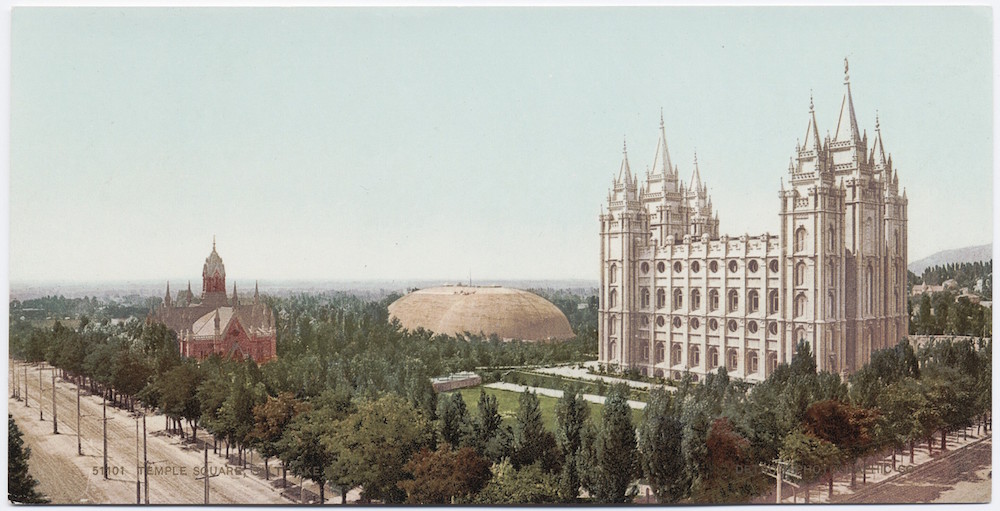 Temple Square, Salt Lake, 1898. Built as a Mormon temple in 1847, the Temple is owned by The Church of Jesus Christ of Latter-day Saints