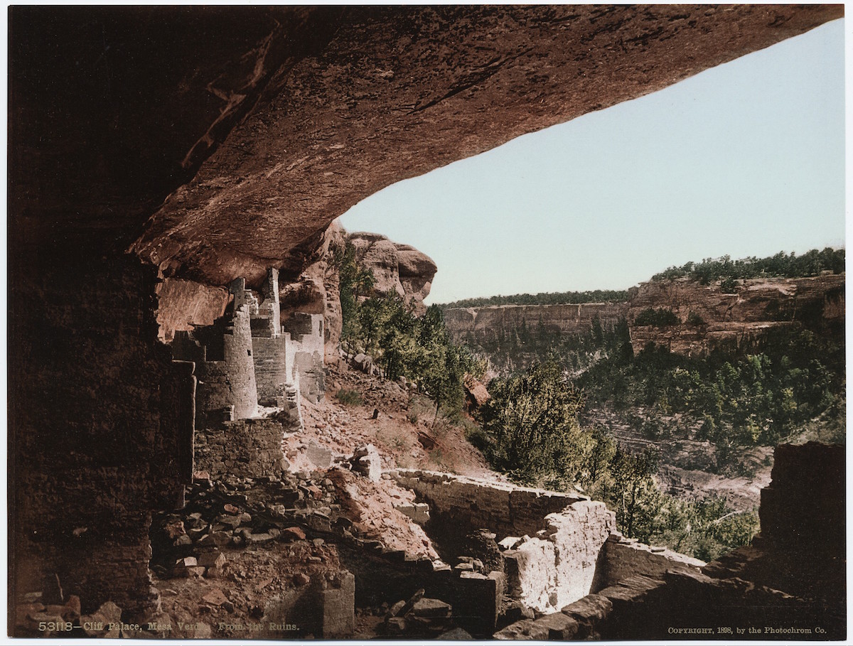 Cliff Palace, Mesa Verde, from the Ruins, 1904. The structure built by the Ancestral Puebloans is located in Mesa Verde.