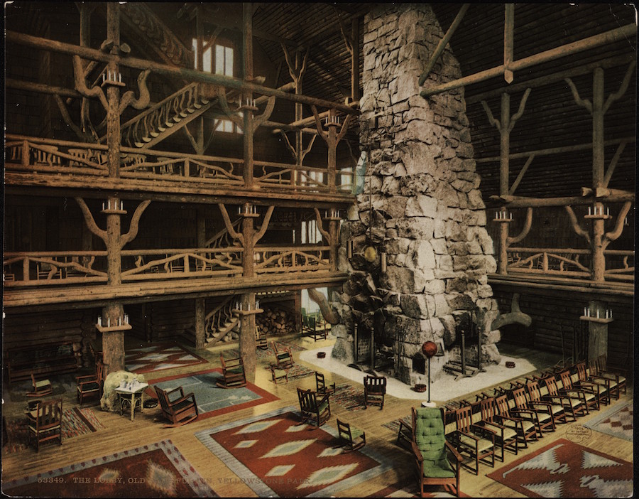 The Lobby, Old Faithful Inn, Yellowstone Park, ca 1897, still open .
