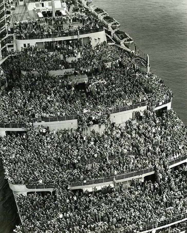 The liner Queen Elizabeth is filled with the American troops coming home from war. Wow!