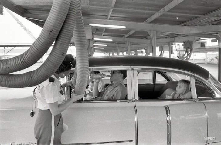 10. Enjoying a meal in the car while getting cooled air piped in the car. This is a drive-in restaurant, in Texas, 1957.