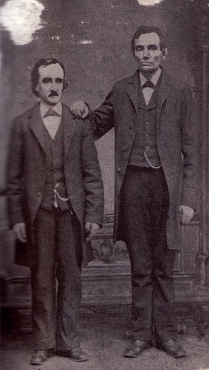 Edgar Allan Poe poses with Abraham Lincoln in Mathew Brady’s Washington ,D.C. studio, 1849
