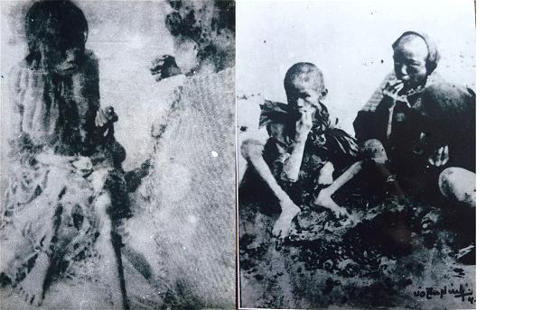 Không có gì để ăn khiến người già trẻ em, thậm chí thanh niên trai tráng cũng trở nên tiều tụy. Trong ảnh trái, là một thiếu phụ với thân hình da bọc xương trong hàng ngàn thiếu phụ hiện ra khắp nơi năm 1945. Ảnh phải được nghệ sĩ nhiếp ảnh Võ An Ninh chụp tại Thái Bình, khi ông tới thì cả cha mẹ của ba anh em đã chết đói.