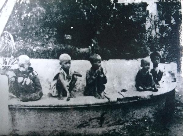 Khi xin được ít cháo, hai em bé đổ cháo vào miệng bố, nhưng cháo chảy ra ngoài, vì hàm răng đã cứng lại. Ảnh chụp tại Phủ Lý, Hà Nam.