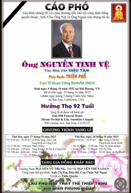 Nhận hung tin Nhà Văn Nguyễn Tinh Vệ - Bút hiệu Diệu Tần